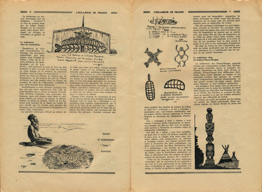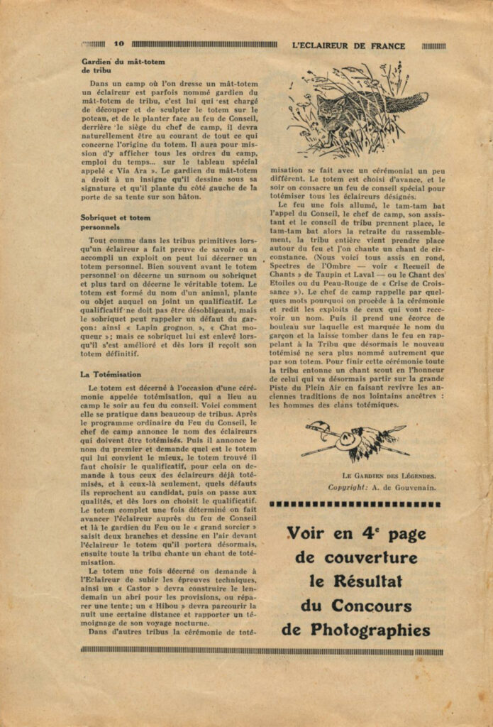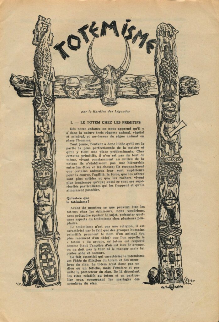Dans la revue l’Eclaireur de France (version 1932 à 1948), le « gardien des légendes » écrivait régulièrement des articles autour du cadre symbolique des EDF. Ici il nous parle du « Totémisme » (ou totémisation comme aujourd’hui).