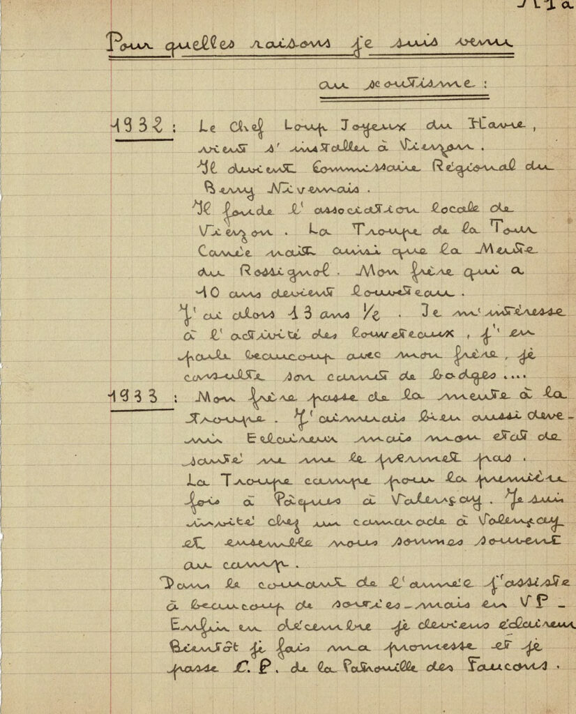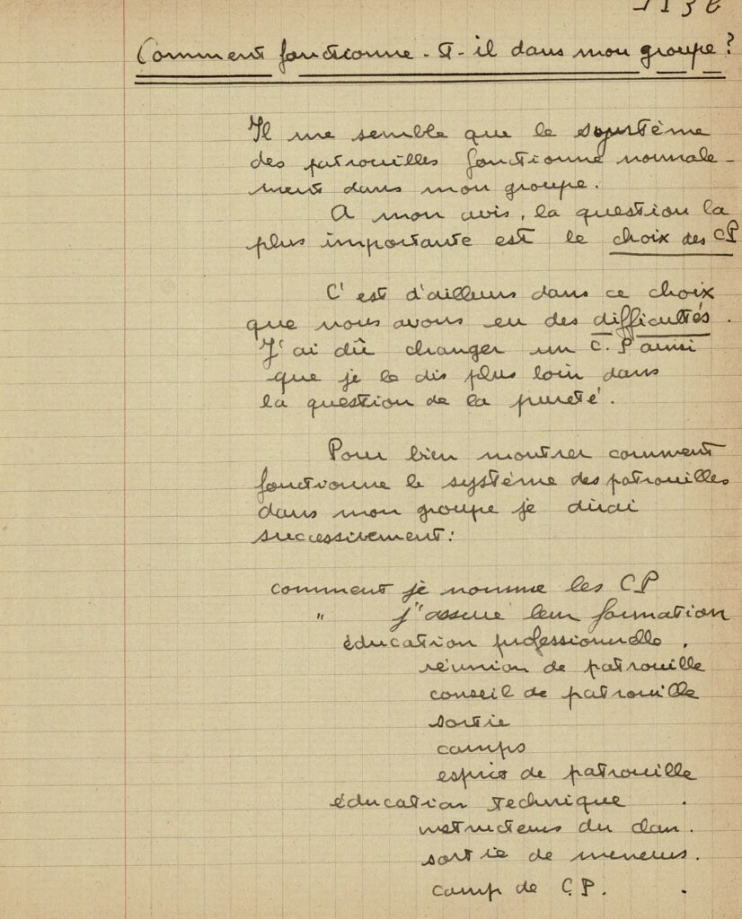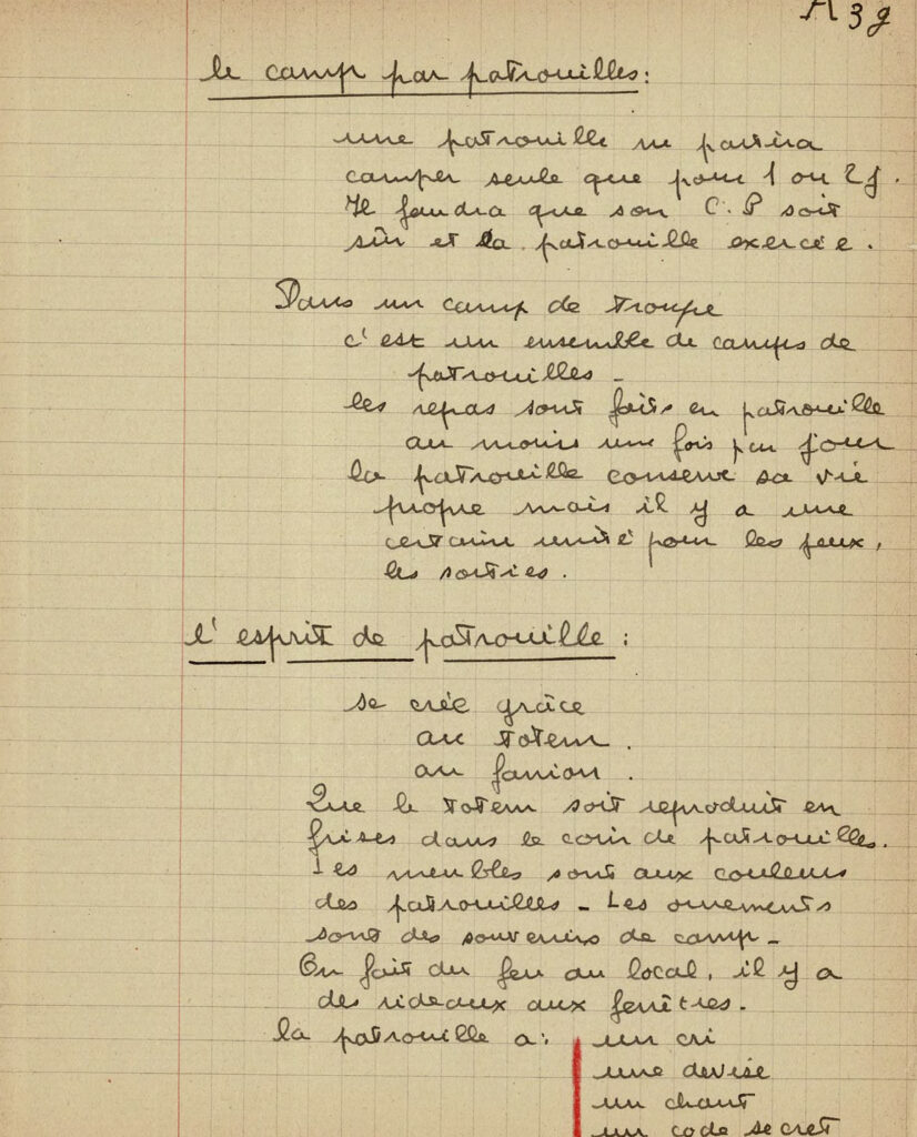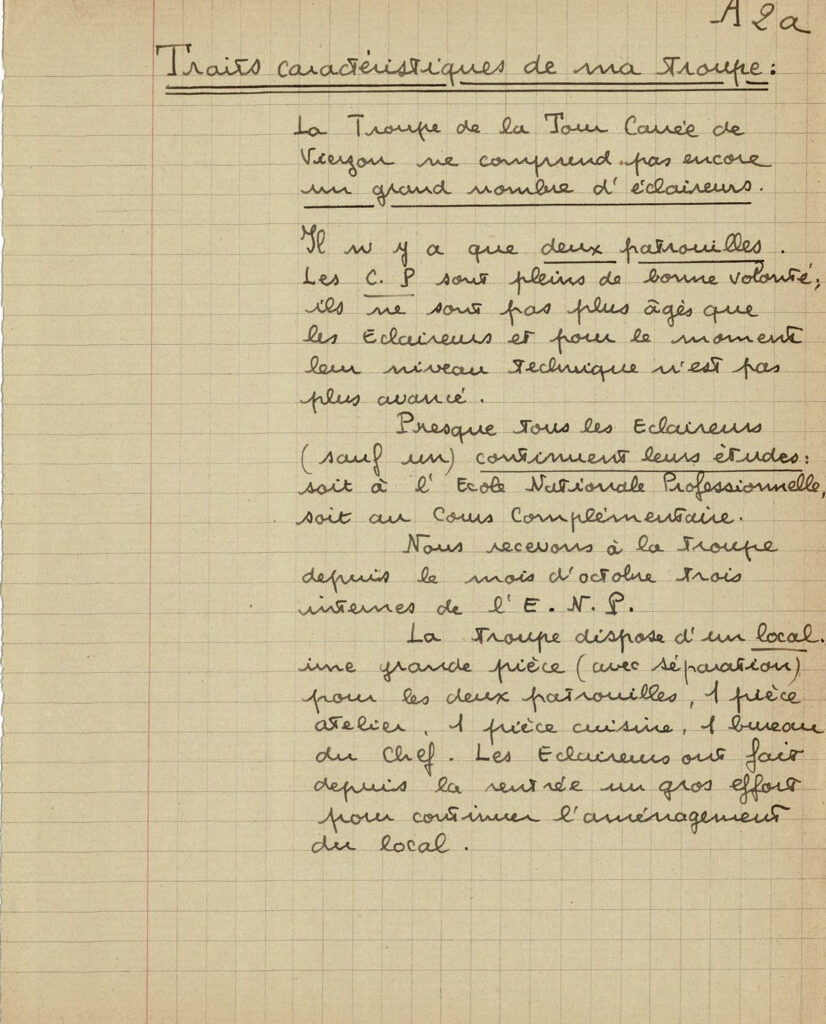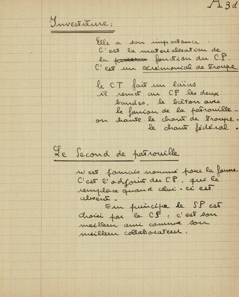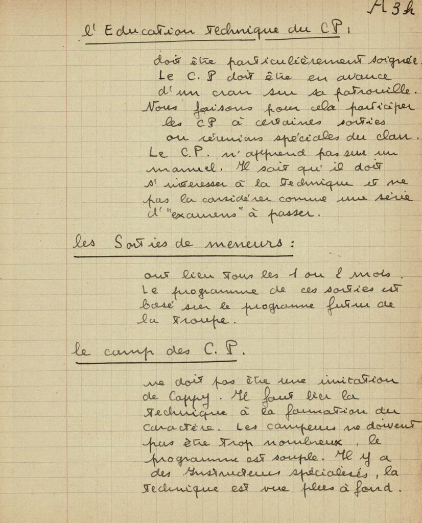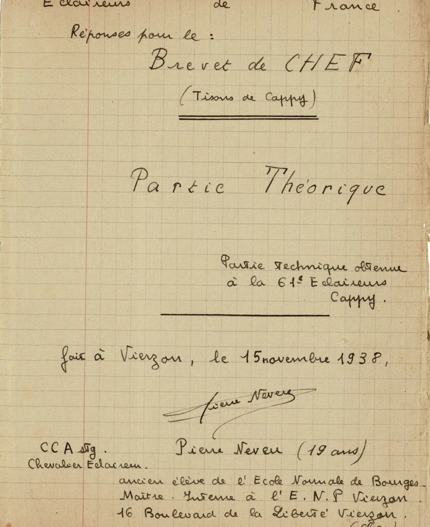 Voici la première partie du cahier « A » de Pierre Neveu qui nous renseigne sur les contenus de formation théorique d’un Cappy en 1938. Pour obtenir ses Tisons, il fallait plancher dur ! cette première partie correspond aux 3 premières questions posées dans la première série au futur « Chef Eclaireur ».
