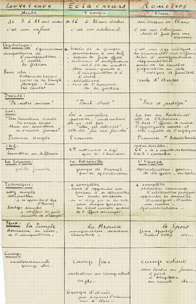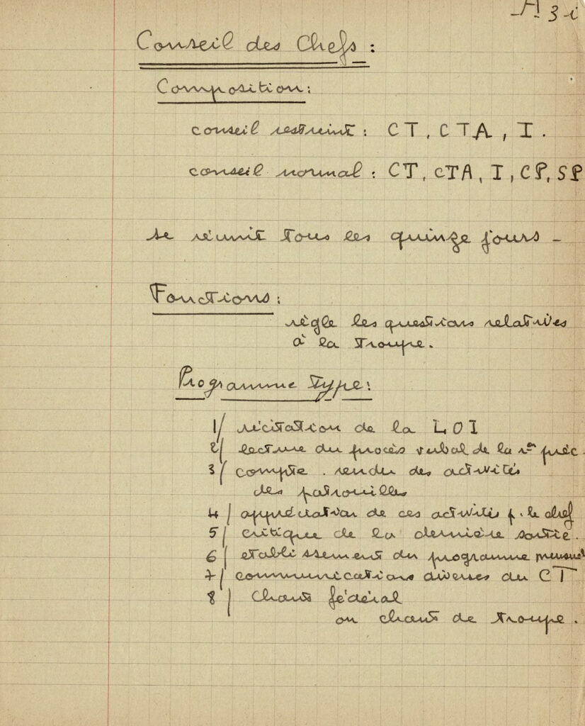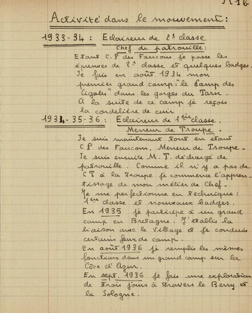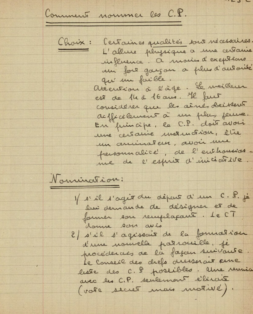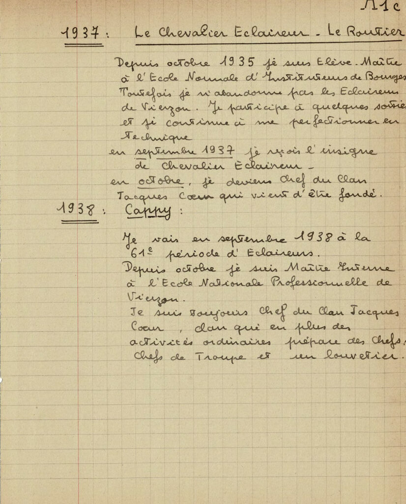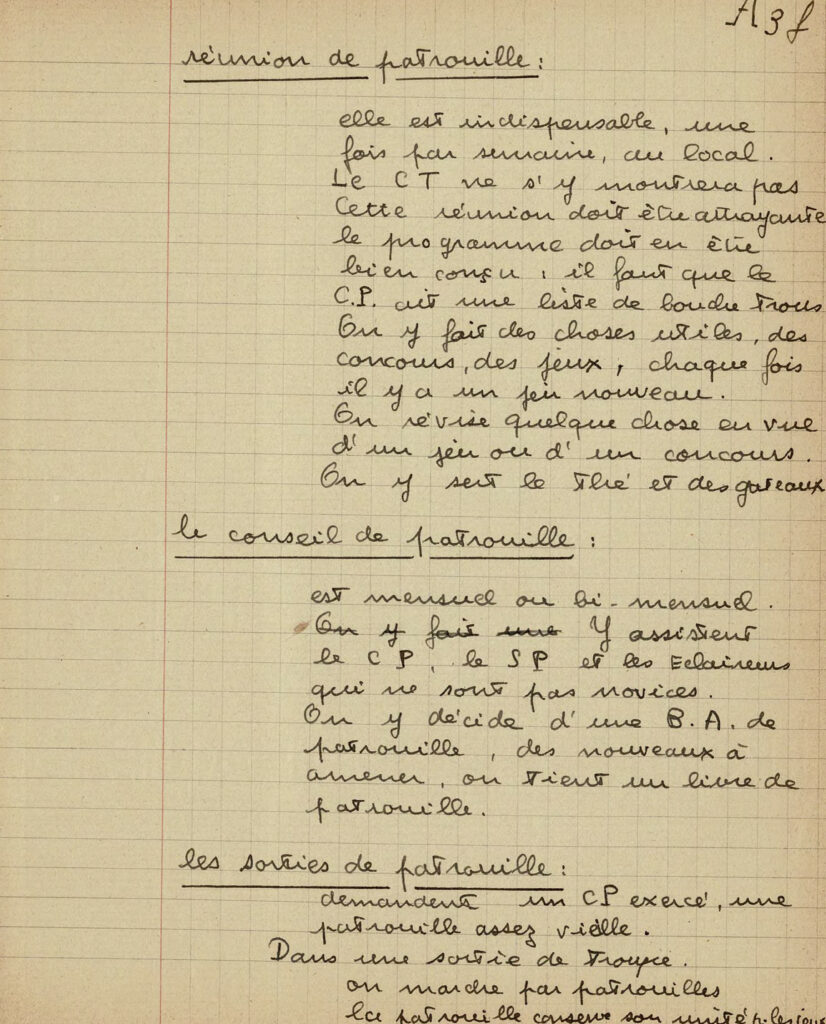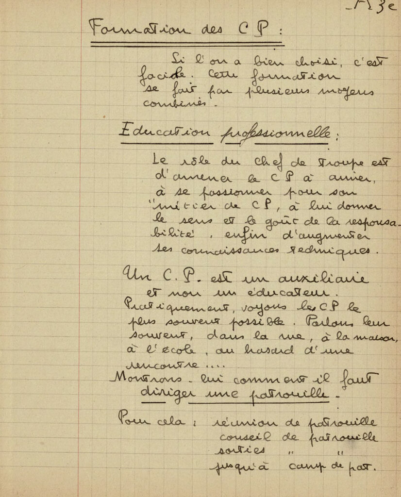 Voici la première partie du cahier « A » de Pierre Neveu qui nous renseigne sur les contenus de formation théorique d’un Cappy en 1938. Pour obtenir ses Tisons, il fallait plancher dur ! cette première partie correspond aux 3 premières questions posées dans la première série au futur « Chef Eclaireur ».