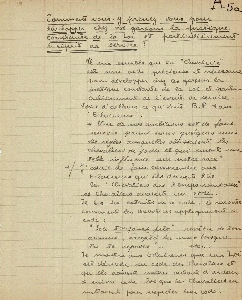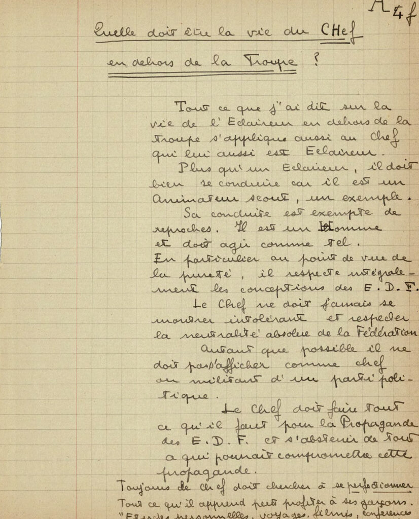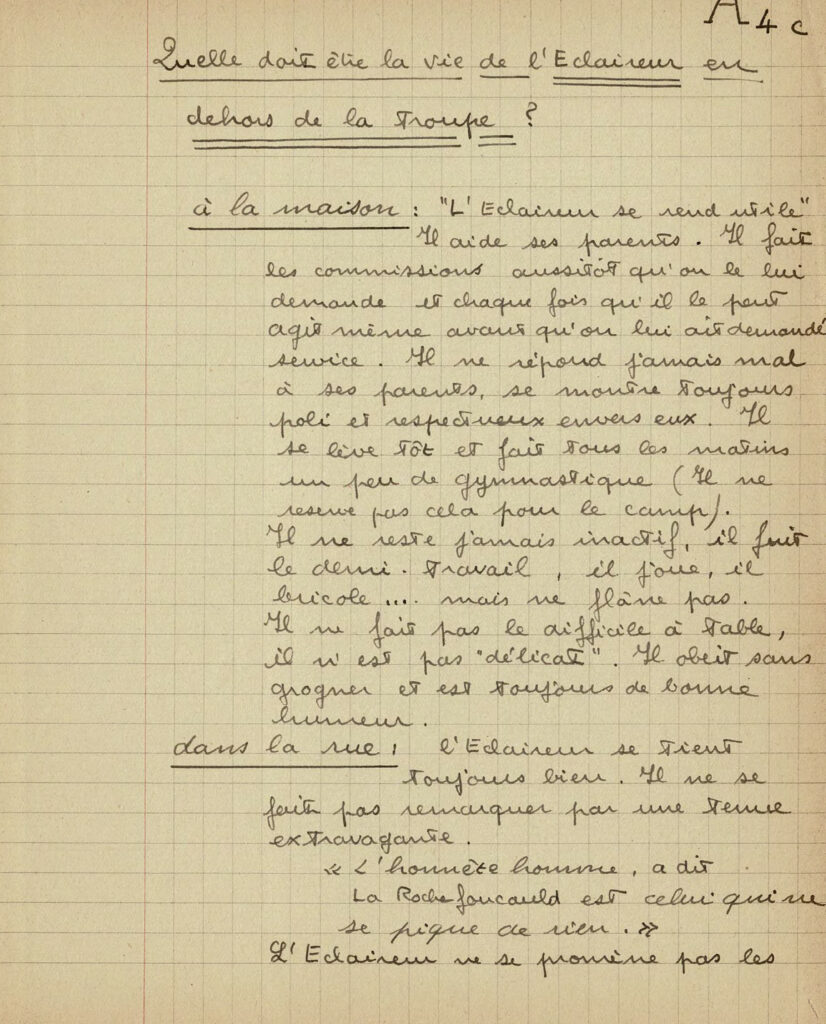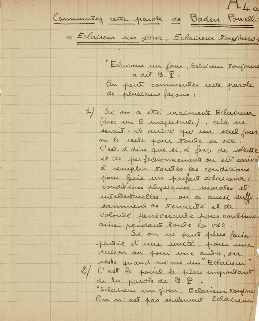 Voici la première partie du cahier « A » de Pierre Neveu qui nous renseigne sur les contenus de formation théorique d’un Cappy en 1938. Pour obtenir ses Tisons, il fallait plancher dur ! cette première partie correspond aux 3 premières questions posées dans la première série au futur « Chef Eclaireur ».